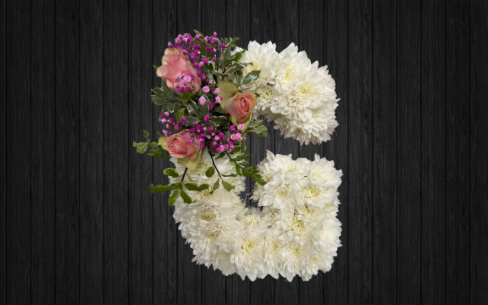 Letter G in pink and white colours flowers used are roses, wax flower and foliage. Price: Standard (without ribbon) - Deluxe (with ribbon) - Luxury (with stand)