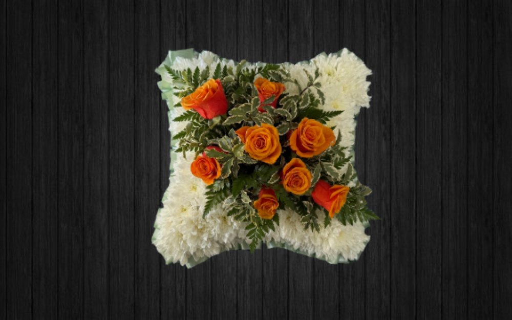 Cushion using orange roses and foliage on white chrysanthemums base and green ribbon edge. Price: 12" Standard - 15" Deluxe - 18" Luxury